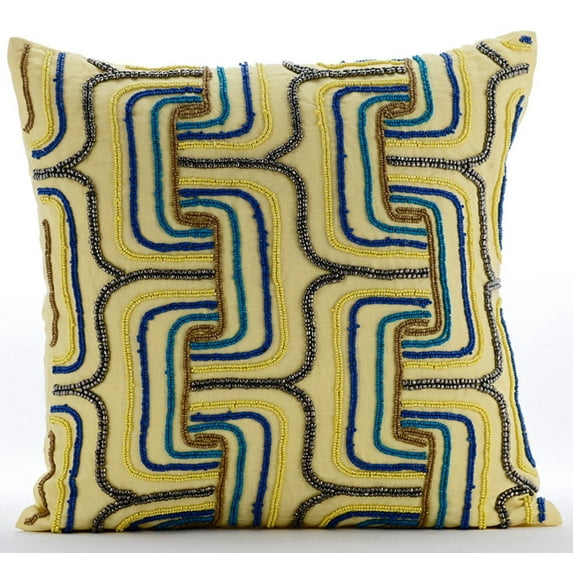 Yellow Accent Pillow, Multi Color Beaded Maze Lattice Trellis Pillow Cover, 18x18 inch (45x45 cm) Pillow Cover, Square Linen Pillow Cover Couch, Geometric Art, Modern - Absolute Wonder
