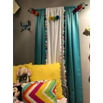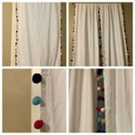 I just love these Your Zone White Pom Pom Single Curtain Window Panel. This white light filtering panel have multi colored pom pom's trim edge to bring the party to my kids room. I received 2 panels and I have 2 windows in my granddaughters guest room so I decided to get creative. I add the Pom Pom panel in the middle of the already turquorise curtains hanging. I think its so cute. With pink, turquoise, navy, coral, and white pom poms it matched their room perfectly. The rod pocket made hanging them a breeze. Your Zone White Pom Pom Window curtain is 38-inches wide and 84-inches long. The panel feels heavier than I anticipated says it is Made with 100% polyester microfiber so it hangs really nicely. I just can't rave enough about the Your Zone White Pom Pom Single Curtain Window Panel.