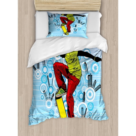 Youth Twin Size Duvet Cover Set, Teenager Playing Skateboard on Street with Abstract City Background Circles Buildings, Decorative 2 Piece Bedding Set with 1 Pillow Sham, Multicolor, by Ambesonne