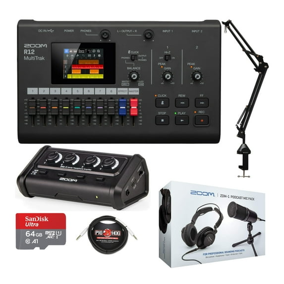 - Bundle Includes: Zoom R12 Multi Track Portable Recorder, Zoom ZDM-1 Podcast Microphone Pack Accessory Bundle, Zoom ZHA-4 Handy Headphone Amplifier, Desktop Boom Arm Microphone Stand, 10-Feet 1/4 to 1/4 Inch 8mm TS Cable, and 64GB Ultra UHS-I MicroSDHC Memory Card