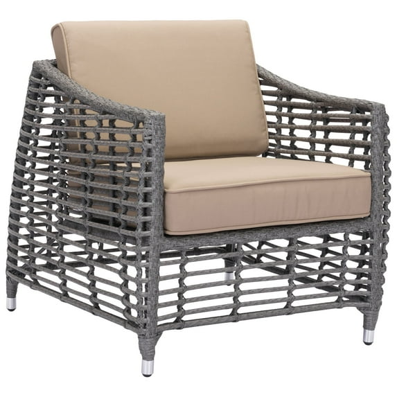 Settle into the Zuo Modern Trek Beach Aluminum Patio Arm Chair and breathe in the fresh air in absolute comfort. Its supportive foam seat cushions and sloped arms make the chair a luxurious place to sit. Designed to resemble natural wicker, the gray arm chair is fabricated out of weatherproof synthetic woven material over rustproof galvanized aluminum. The beige Sunproof upholstery dries quickly and resists fading in the sun.