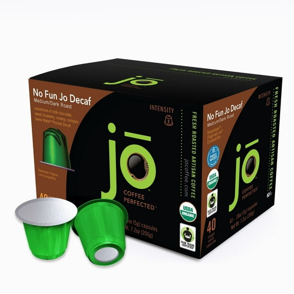 Hero image 0 of NO FUN JO DECAF: 40 Organic Nespresso Compatible Espresso Pods for Original Line Brewers, Medium/Dark Roast, Swiss Water Process Decaf, Fair Trade Certified, for Espresso, Ristretto or Lungo, 0 of 6