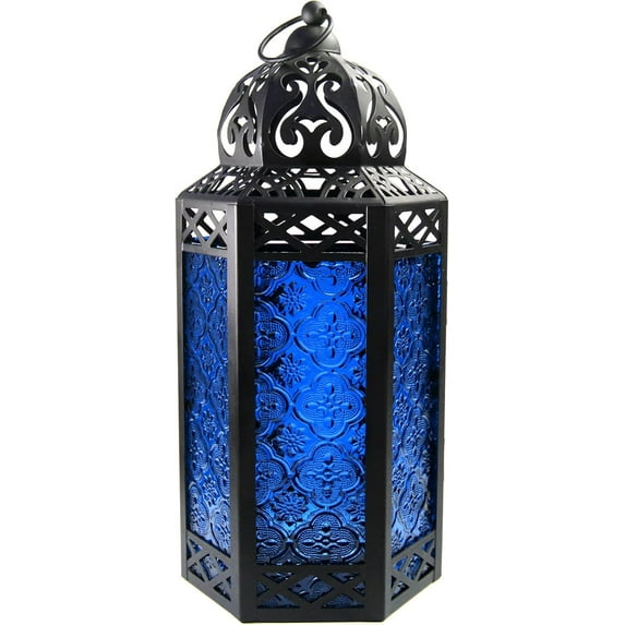 Moroccan Metal Candle Lantern Holder with LED Fairy String Lights, Large, Cobalt Blue