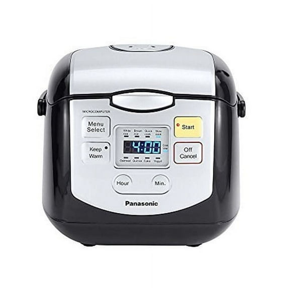 Panasonic. The SR-ZC075 has 8 pre-set programs: White Rice, Quinoa, Cake, Slow Cook, Quick Cook, Brown Rice, Oatmeal, and Yogurt. When cooking is complete, the appliance switches to keep-warm mode for up to 12 hours. The unit has a durable non-stick inner pan for easy cleanup. Included accessories: rice scoop and measuring cup. Conveniently prepare up to 4 uncooked cups of rice (8 cups cooked) with this sleek, black and silver rice cooker, ideal for singles, couples and small families. Microcomputer heating control continually monitors and regulates heat for precision cooking, consistently even texture and better tasting results. Durable, non-stick black fluorine-coated inner pan evenly conducts and retains heat in every grain of rice. And makes after-meal cleanup quick and easy. Select from eight automatic menu options for a variety of rice, plus hot cereals, soups, yogurt, quinoa and more on an easy-to-use display and touch buttons. Smart keep warm function maintains optimum freshness and serving temperature for up to 12 hours. A precise measuring cup and rice scoop are included. Aluminum. Black. Hand Wash.