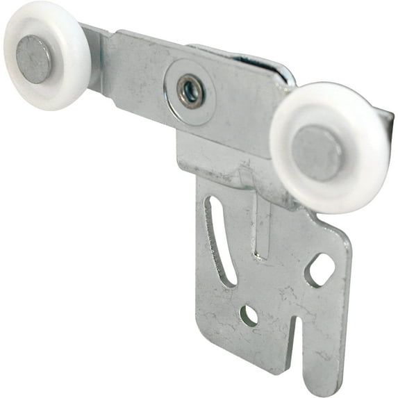 This is a side mounted, top hung wardrobe roller assembly with a tandem 7/8 in. convex nylon wheel for the front sliding wardrobe door. The stamped steel bracket assembly is adjustable and has an 1/4 in. offset. It is fitted onto the wardrobe front door and fits 3/4 in. to 1-3/8 in. thick doors. Used by Acme and Stanley door systems, as well as a variety of other wardrobe door manufacturers. For the back wardrobe door roller assembly use Prime-Line part N 6503.