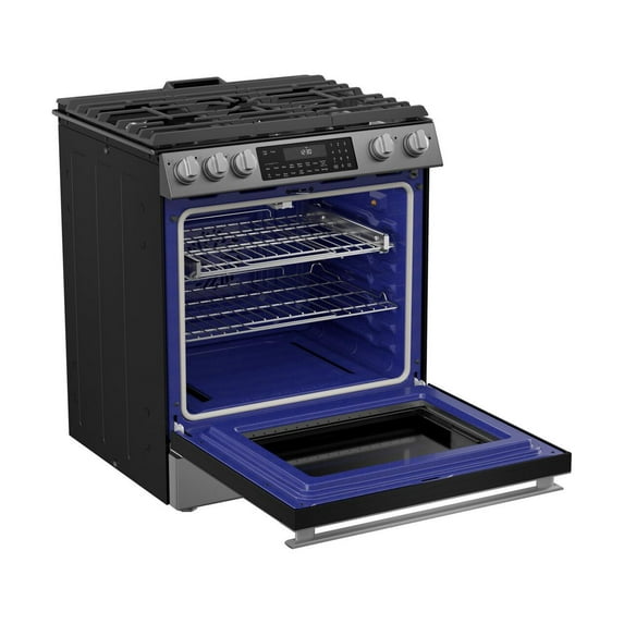 I was looking for a basic, solid built stove without added WiFi gadgets. The Sharp stove has performed well. Simple instructions for burner flame adjustments. Had to adjust foot height to maximum because top frame sits above, but not directly on top of the counter to prevent counter debris from dropping down between stove and counters. The oven is large and the blue color is beautiful. The cook area is easy to clean. Knob controls are illuminated when turned on. I converted from electric to gas. NOTE: Even though I already had an interior gas line I had to have a plumber remove the interior cap and add additional line before the delivery. Overall, I am extremely pleased.