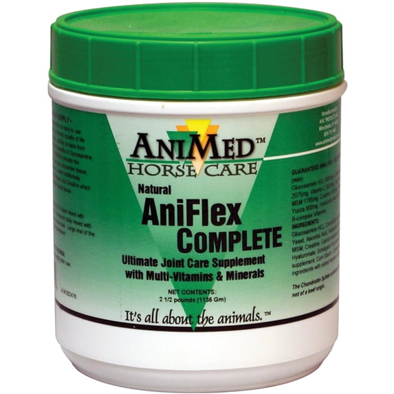 AniMed AniFlex Complete For use in all classes of horses. AniMed AniFlex Complete's unique, natural formulation is easily absorbed to help maintain the health and resiliency of joints and connective tissue, while maintaining healthy bone, connective tissue and joint structure and function. Glucosamine, Chondroitin and Hyaluronic Acid are natural substances that may stimulate the production of proteoglycans. Proteoglycans help to maintain the health and resiliency of joints and connective tissues. MSM is a bio-available source of sulfur for connective tissue support. Antioxidants help remove damaging free radicals. Creatine helps to maintain healthy bone, connective tissue and joint structure and function. Features: Unique blend of Glucosamine, Chondroitin, Hyaluronic Acid, MSM, Antioxidants, and Creatine Natural substances are easily absorbed Easy-to-feed powder . Item Specifications: Active Ingredients per oz.: Glucosamine HCL (shellfish): 5000mg Hesperidin: 3475mg Chondroitin Sulfate (porcine): 2075mg MSM (Methylsufonylmethane): 1775mg Creatine: 1000mg Hyaluronic Acid: 50mg Inactive Ingredients: Ascorbic Acid (Vitamin C), Brewers Yeast, Calcium Ascorbate (Vitamin C), Corn Starch, Dl-alpha Tocopheryl Acetate (Vitamin E), Yucca (flavoring agent) Directions For Use: 1 oz per 1,000 lb. Supply horses of all classes 2 Tbsp of powder daily for 14 days, then provide 1 Tbsp daily for maintenance. The large end of the enclosed scoop measures 1 Tbsp; approximately 1/2 oz. Size: 16 oz./1 lb. (up to 16-day supply) 2.5 lb. (up to 40-day supply) 5 lb. (up to 80-day supply) 20 lb. (up to 320-day supply) WARNINGS: For animal use only. Keep out of the reach of children and other animals. In case of accidental overdose, contact a health professional immediately. This product should not be given to animals intended for human consumption. Keep tightly sealed and store in a cool, dry place. For Product Information and MSDS Sheet, please click on Manufacturer's Inform