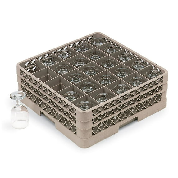 Use this Traex Beige Glass Rack with 25 Compartments and 2 Extenders, to efficiently store glassware in your restaurant. Model # : TR-6BB Open Profile Allows Top To Bottom And Side To Side Thorough Washing And Air Circulation Built-In Base Rack Dividers Provide 100% Vertical Snap-Fit Extenders Will Not Loosen Over Time Or Come Apart Heat Resistance Up To 180°F For 30 Minutes Maximum Height: 6.375" Can accommodate glasses up to 3.53" in diameter The Warranty Does Not Apply To Products Purchased For Personal, Family Or Household Use