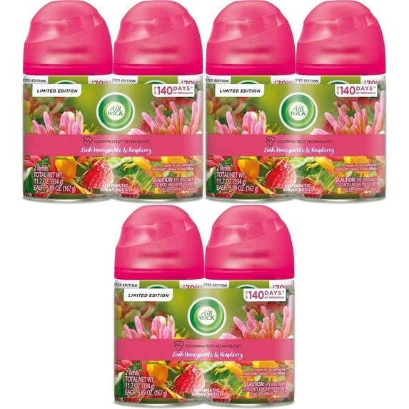 Air Wick Automatic Air Freshener Spray Refill, Lush Honeysuckle & Raspberry, Essential Oils - 6 PackAir Wick Automatic Air Freshener Spray Refill Lush Honeysuckle Raspberry Essential Oils 6 PackAir Wick Freshmatic Air Freshener Automatic Spray Refills Sparkling Citrus 6 RefillsAir Wick Freshmatic Refill Automatic Spray Air Freshener Fresh Pine Juniper 5 89 oz 175 Gram Pack of 6Air Wick Freshmatic Refill Automatic Spray Air Freshner Apple Cinnamon Medley