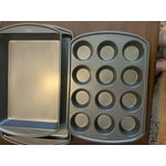 - Comprehensive Set: The set includes a 15-1/4"W x 10-1/4"L baking sheet, a 13"W x 9"L x 2"H oblong pan, and a standard 12-cup muffin pan.