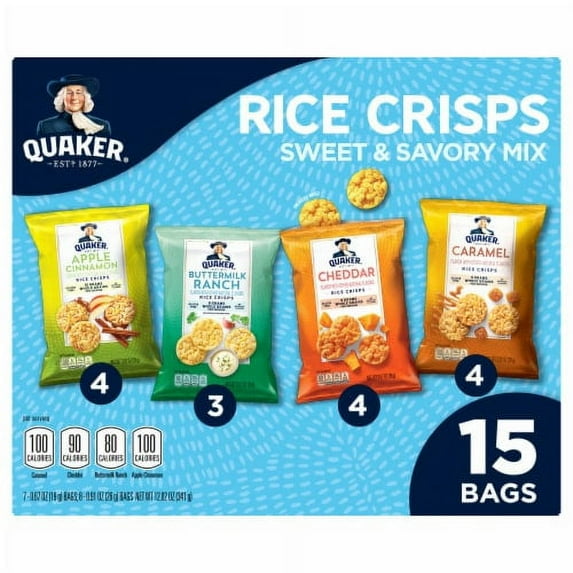 1374.1 out of 5 Stars. 137 reviewsSave withShipping, arrives tomorrowSNAP EBT eligibleQuaker Rice Crisps, Sweet and Savory Variety Pack,Gluten Free, 14 Count $14.08 Was $15.66 $1.27/oz