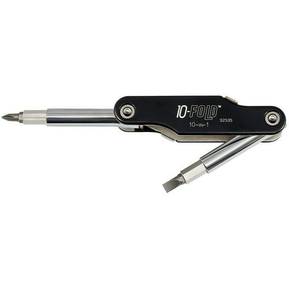 - Folding pocket-style 10-in-1 tool with interchangeable bits - 8 screwdriver sizes and 2 nut drivers