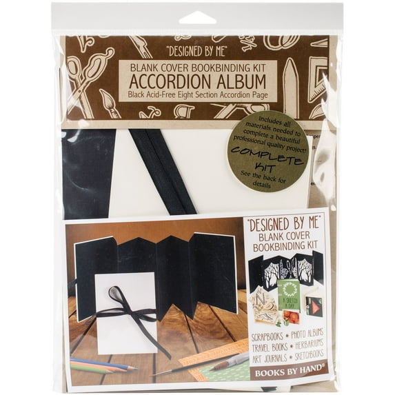 Lineco-Books By Hand Designed By Me Blank Cover Bookbinding Kit: Accordion Album, Black. Fun, fast and easy to make! This kit includes everything you need to complete a beautiful professional quality project! This package contains pH neutral bookboard, one 40x7 inch acid free page (forms eight 5x7 inch sections), ivory cover paper, ribbon and instructions to make one 5.25x7.25 inch accordion album with eight sections.