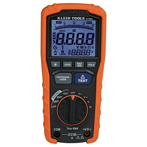 The ET600 is a multi-function megohmmeter capable of producing 125V, 250V, 500V and 1000V test voltages for insulation resistance measurements up to 4000M. Also tests AC/DC voltages up to 1000V with automatic ranging True RMS technology. Convenient lock function and built-in stand for hands-free operation. Dual-function backlit display monitors process. For more than 160 years, Klein Tools has manufactured premium-quality, professional-grade hand tools that deliver the performance, durability and precision needed to get the job done right. Our family of engineers, workers, and craftsmen continues to put six generations of expertise into every tool we create by using only the highest quality materials and superior workmanship, and keeping manufacturing as close to home as we can. Klein isn't just the name of our company, it's also our family name. And since we're an American company that's family-owned and family-run, you know you can count on us to be here tomorrow. Klein Tools doesn't just make great products, we make great products that stand up to the demands of the professionals who use them every day. Since 1857.