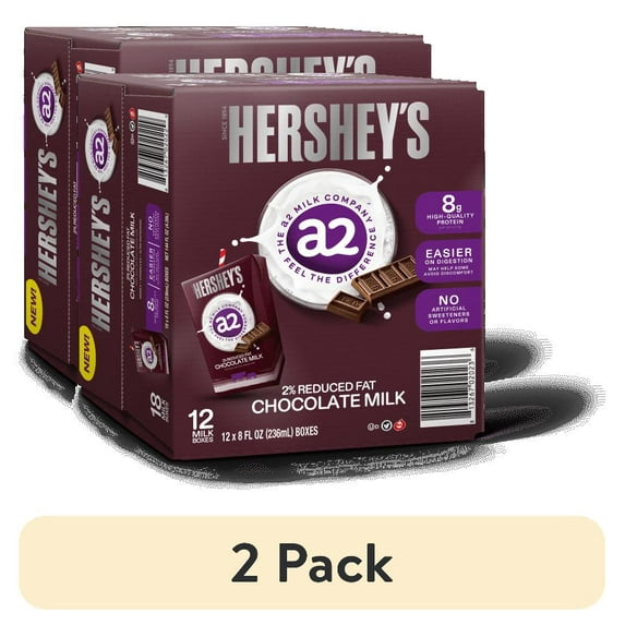 - 2-pack of HERSHEY’S a2 Milk® Chocolate 2% Reduced Fat Milk Boxes, 8 oz, 12-Pack