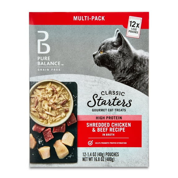 - Pure Balance Grain Free Gourmet Wet Cat Treats, Shredded Chicken & Beef Recipe, 1.4 oz Pouches, 12 Count