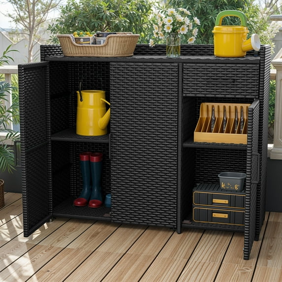- Robust & Weather-Endurance: Crafted with weather-resistant rattan and a sturdy metal frame, this storage cabinet stands strong against sun, water, and daily wear. Its corrosion-resistant finish ensures long-term durability.