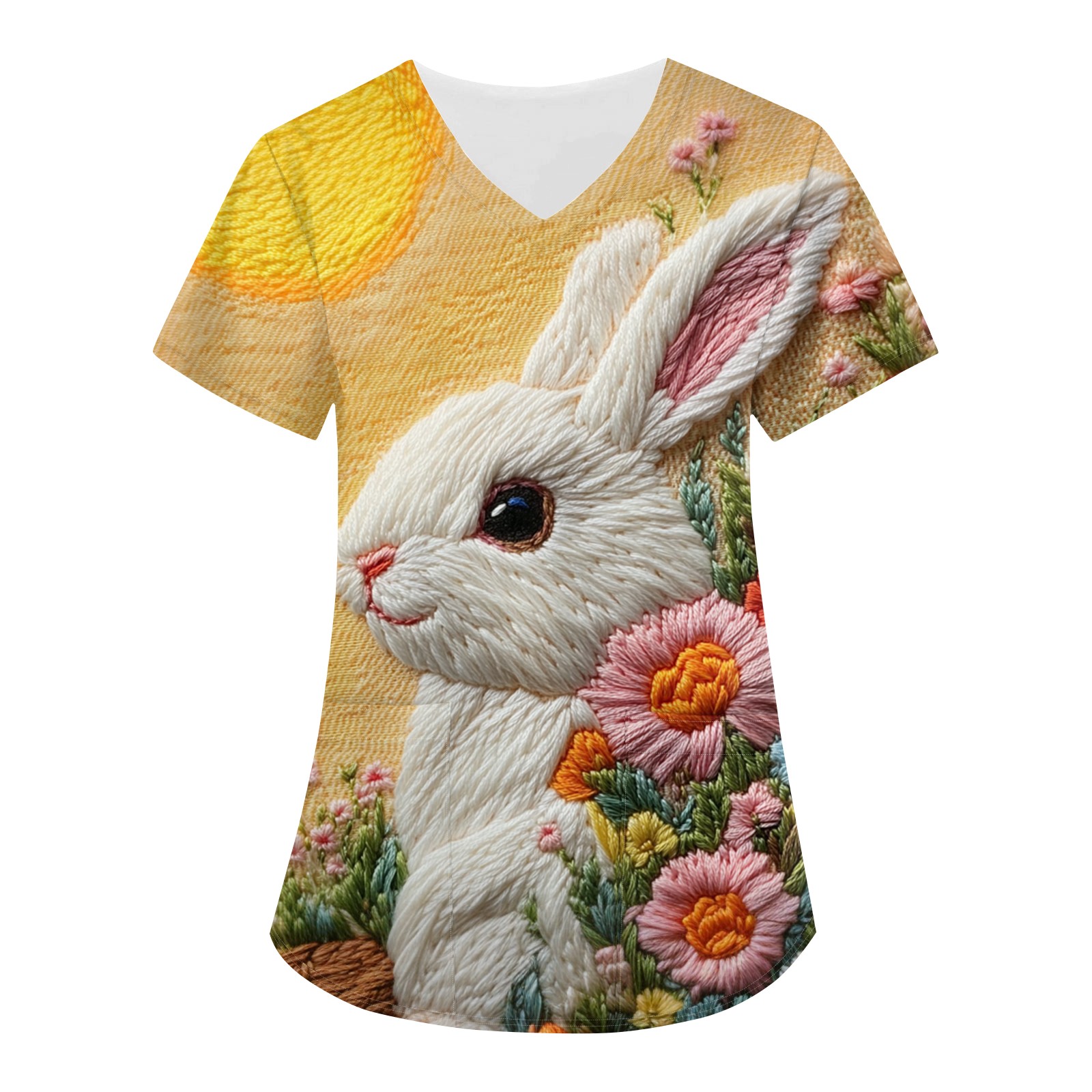 Hero image 0 of ADSSDQ Easter Scrub Tops Women Stretchy Vneck Short Sleeve Bunny Egg Hunt Print Nurse Working Uniforms with 2 Pockets Yellow XL, 0 of 6