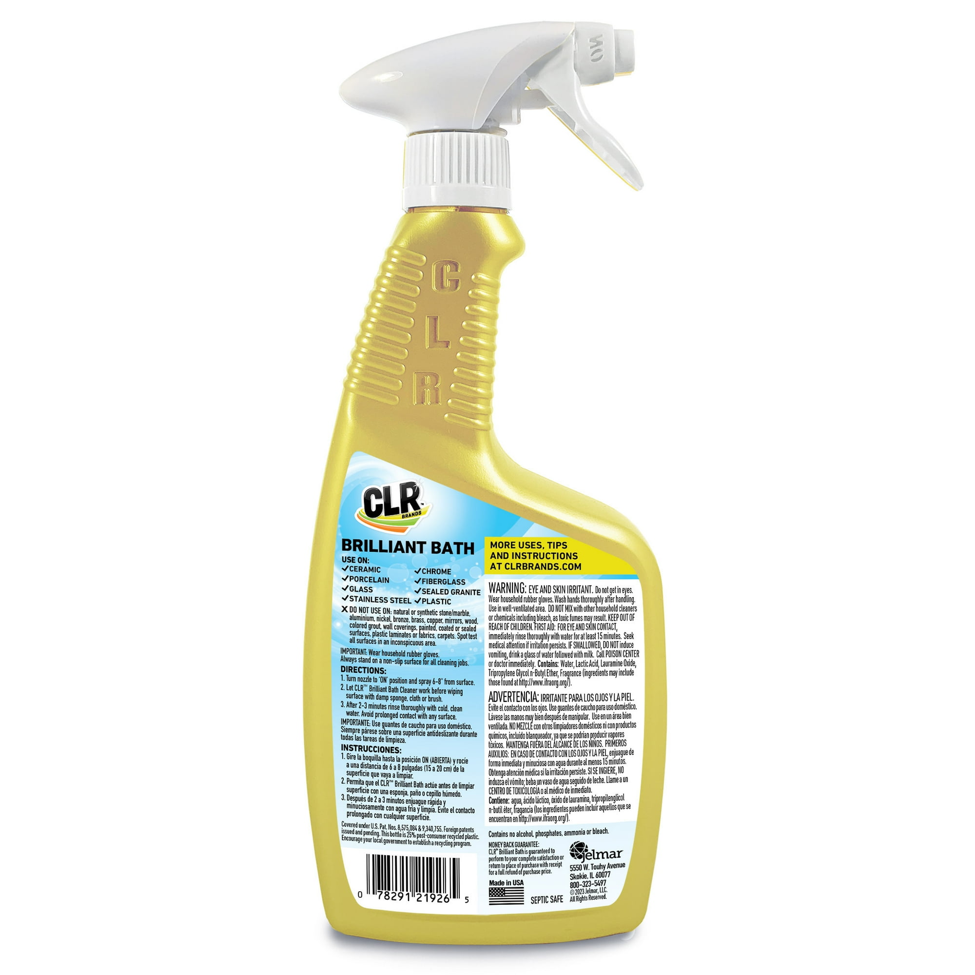 CLR Brilliant Bath Multi-Surface Cleaner has a powerful foam spray formulated to quickly cut through dirt, calcium, lime, hard water deposits, and soap scum. Use CLR Brilliant Bath cleaner on most kitchen and bath surfaces. It is safe to use on ceramic tile, shower doors, sinks, bathtubs, white grout and caulk, toilet bowls, fiberglass, and kitchen countertops. CLR Brilliant Bath contains no phosphates, ammonia, or bleach. It is part of the EPA's Safer Choice Program, recognizing the product as a safer alternative to chemicals. This CLR bathroom cleaner will not remove rust.