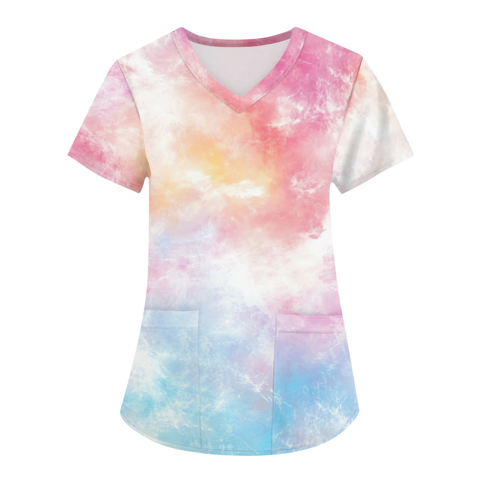 BDPORKAS Womens Scrubs Breathable Short Sleeve Scrubs Uniform Tie Dye Printed Trendy Soft V Neck Nurse Uniforms Shirts Pocketed