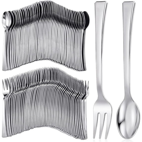 4.6 out of 5 stars300 Pieces Plastic Mini Appetizer Forks and Spoon 4.53 Inch Stainless Steel Finished Silver Disposable Silverware Heavy Duty Plastic Tasting Dessert Tableware for Party (Spoon and Fork)