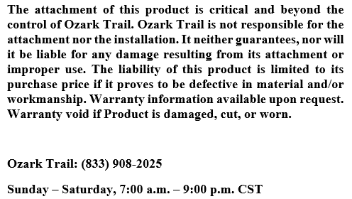 The attachment of this product is critical and beyond the control of Ozark Trail. Ozark Trail is not responsible for the attachment nor the installation. It neither guarantees, nor will it be liable for any damage resulting from its attachment or improper use. The liability of this product is limited to its purchase price if it proves to be defective in material and/or workmanship. Warranty information available upon request. Warranty void if Product is damaged, cut, or worn. Ozark Trail: (833) 908-2025 Sunday – Saturday, 7:00 a.m. – 9:00 p.m. CST