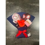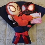 - Bouquet Full of Plushies: Wrapped in a blue fabric sleeve with a shiny red bow, this 13-inch fabric bouquet is heroically cute. It features Miles Morales and Gwen Stacy stuffed dolls and 3 plush heart stems.
