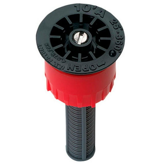 With a 10-foot spraying radius, this sprinkler nozzle sprays from 25 to 360 degrees for full-circle coverage. It comes with a basket filter to keep out grit and sand to ensure many years of dependable lawn watering. With female threading, this Orbit sprinkler nozzle is ideal for watering small garden areas as part of a lawn irrigation system. Perfect for replacing broken and damaged spray nozzles, this Orbit sprinkler system part is durably constructed for long-lasting performance. Features and Benefits: Has area coverage up to 10 feet, Has an adjustable spray pattern that covers in a part or full circle, Replaces broken or damaged sprinkler spray nozzles in pop-up and shrub head sprinklers, Basket filter traps sand and grit, Has a female-threaded inlet.