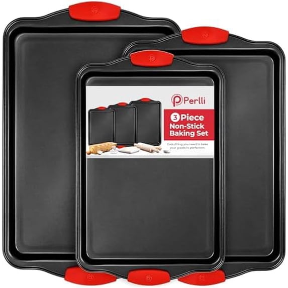 Non-Stick 3-Piece Baking Pan Set, BPA-Free Carbon Steel Bakeware Set with Silicone Handles, Stackable Kitchen Oven Set, Cookie Sheet, Baking Tray, Baking Sheet Set, Oven Safe (446°F)Non Stick 3 Piece Baking Pan Set BPA Free Carbon Steel Bakeware Set Silicone Handles Stackable Kitchen Oven Set Cookie Sheet Baking Tray Baking Sheet