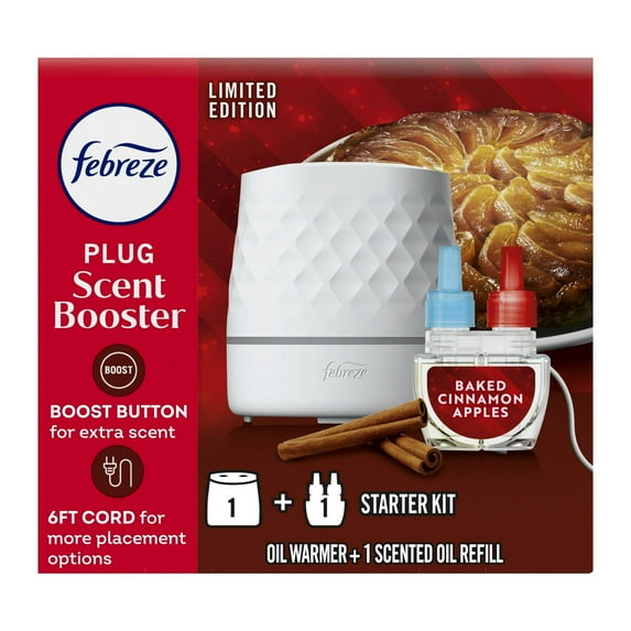 Love Febreze PLUG but wish you had more control over its scent? Now you can get the scent you want where you want it with Febreze PLUG Scent Booster Starter Kit, Oil Diffuser, Air Freshener Plug In, Continuous Scent Device + 1 Baked Cinnamon Apple Refill. More than a typical wall plug-in, this unique oil diffuser provides first-day freshness for 50 days (on low) with more scent control than ever before. Feel invigorated with the effervescent, rejuvenating water and orange blossom freshness found in the uplifting scent of Febreze Refresh & Energize. Embrace the festive season with the cozy aroma of apple crisp and delicious apples. Control your scent, your way: Adjust scent intensity levels from high to low (and even off when you’re away) based on your preference and space. And when the continuous scent isn’t enough, hit the Boost button for 40 minutes of nose-wowing freshness. Conveniently works with your favorite existing Febreze PLUG refills. This nifty device also comes with a cord so you can place it high, low, anywhere you want it… and make scent a centerpiece, not a wallflower. Plus, the simple and sleek design of this oil warmer air freshener is a perfect match to any décor, whether it’s in your living room, bathroom, or kitchen. Let the essence of apple crisp and delicious apples fill your home, creating a warm and welcoming atmosphere for every festive moment. Whether you're preparing for a festive gathering or just enjoying the scent of apple crisp, Febreze helps keep your space fresh and inviting. Get Febreze PLUG Scent Booster and get more scent, more control, just the way you like it. With the delightful aroma of apple crisp and delicious apples, your home will be ready for every festive occasion.