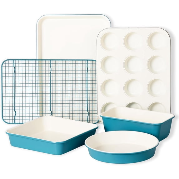 Hero image 0 of 6-Piece Nonstick Ceramic Baking Pans Set - Bakeware Sets Including Cookie Sheets for Baking, Muffin Pan, Bread Pan, Cake pan, Loaf Pan, Cooling Rack, Light Blue & Cream White, 0 of 4