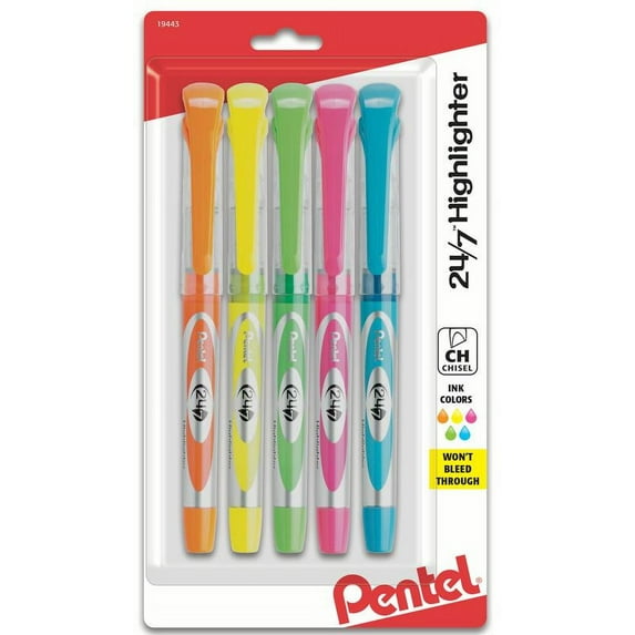 Pentel 24/7 Liquid Highlighter, Chisel Tip, Assorted Ink (F/G/P/K/S), 5-Pk