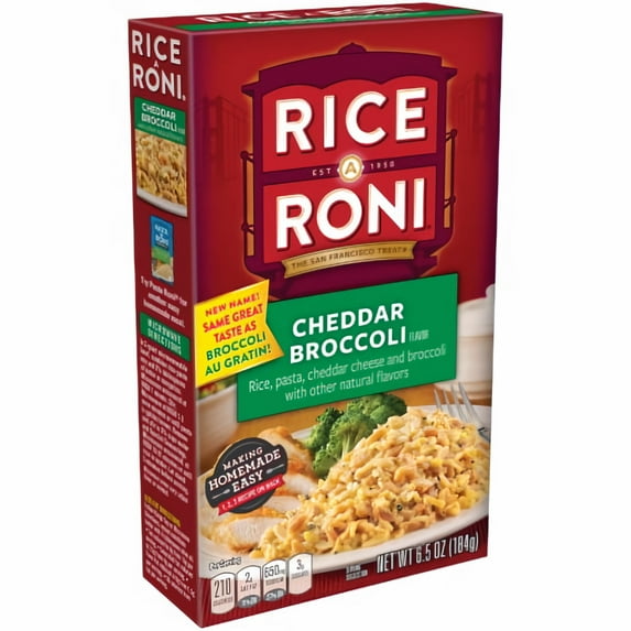 3 optionsAvailable in additional 3 options$1057current price $10.57Rice-A-Roni Cheddar Broccoli Flavor Rice 6.5 oz Cardboard Box Packaged Meal Dry Uncooked Rice (Pack of 3)