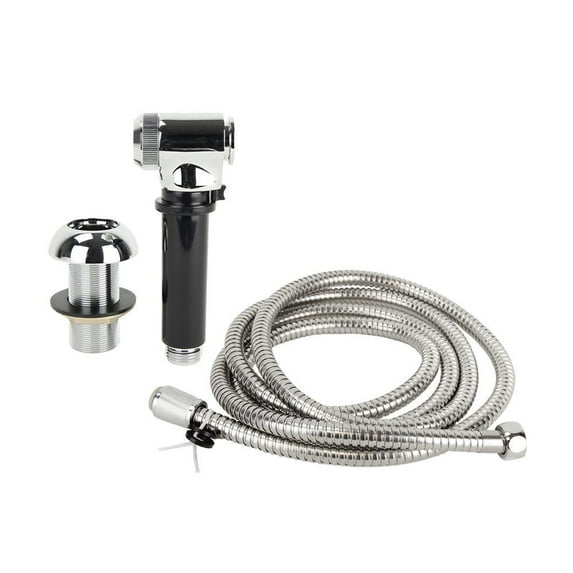 - Three-piece replacement set comes with straight handle sprayer, 8’ stainless steel hose, and through-hull receptacle