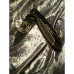 Durable 8CR13MOV Stainless Steel. Smooth drop point blade foe everyday usage. Lightweight metal body with comfort grip for secure hold. Blade length 2.88. Black oxide coated blade for corrosion resistance.