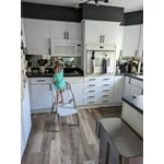 [This review was collected as part of a promotion.] This is a very versatile highchair! Not too big and can be adjusted to pull up to a table to have baby at same height as family. Has a removable, dishwasher safe tray and chair can later be used as a child's booster seat and step stool!