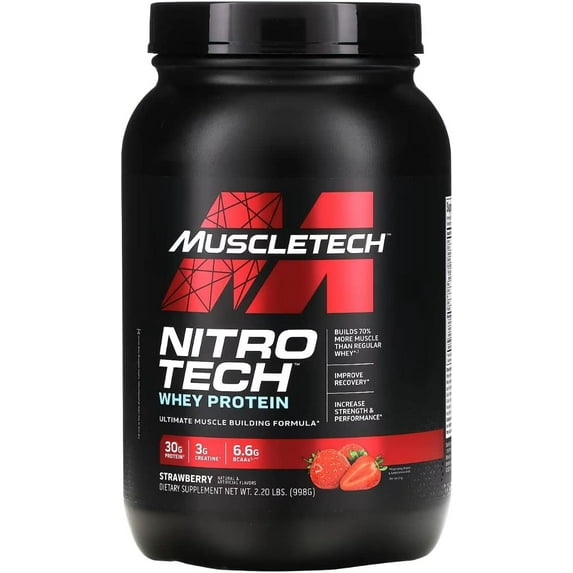 MuscleTech Performance Series Nitro Tech Whey Protein Supplement Powder Strawberry 2lb: 30g of Whey Protein 3g of clean Creatine Monohydrate 6.8g of BCAA's 5g of Glutamine & Precursor Award-Winning Taste No Gritty Texture Builds 70% more muscle than regular whey Amplifies recovery, performance and strength Whey + isolate peptides as primary source info: