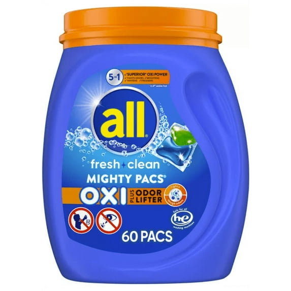 Grab a pac of all Oxi+Odor mighty pacs laundry detergent and say yes to fun family stains. It’s formulated with active stainlifters and in-wash pre-treaters* (*formulated with enzymes for a great clean), to fight your families’ toughest stains. all OXI + Odor mighty pacs laundry detergent’s 5-in-1 cleaning power fights 100% of stain types* (*bleachable, oily/waxy, enzymatic, particulate), whitens, brightens, and leaves your clothes smelling clean with a fresh scent. It is safe to use in any high efficiency (HE) washing machine and it cleans effectively in cold water. all laundry detergent is great for all types of clothes, including activewear. With the 5-in-1 cleaning power of all stainlifters laundry detergent pacs, you don’t have to think twice about jumping in that puddle or slurping that spaghetti. These detergents were made for putting life before laundry. Specifications Scent: Fresh Health Facts: Bleach-Free, Paraben-Free, Dye-Free, Aluminum-Free Product Warning: Keep out of eyes Product Form: Capsule Number of uses: 60