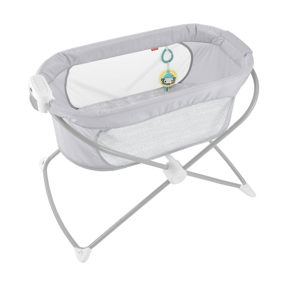 The Fisher-Price® Soothing View™ Vibe Bassinet helps baby sleep in a soothing style wherever you go. The travel crib gently rocks with a light push from you, and it features breezy mesh sides plus calming vibrations, music, and sounds to help soothe baby to sleep. Or, lock the feet for stationary mode and let the baby play with a soft, linkable toy. When it's time to pack up and go, the bassinet easily collapses to a slim fold of under 6 inches. Use only with a child who is unable to push up on hands and knees, pull up, or sit unassisted.