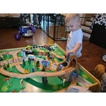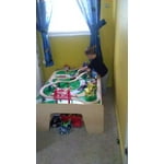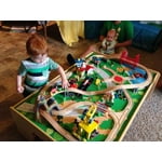 Train tables can be expensive but this one comes with a lot!! And Thomas wooden rail way line works very well with it. My son will be two years and 3 months old! on Christmas Eve! We are giving him the train table on Christmas morning! I did a lot of research on train tables before buying this one, by far the best for your money!! And I had to really save up for this gift for my little boy! It will be one of his best gifts we could ever give him so far! I know he is a big Thomas fan and I added a few of the Thomas wooden rail trains for this table. Could not afford a real Thomas train table, I hope this works!! And I think it will because he is a simple and kind little boy! I also will added Thomas train wall stickers all around the train table to give it the extra look and appeal! I think the price of the table is fair and you really can not put a price on pretend play! I understand the value of a child's play time at every stage of development; I'm not only a mom but I'm also an Early Childhood Educator! I hope this review helps parents who want to support the play time of their children! It will serve them well later in life!