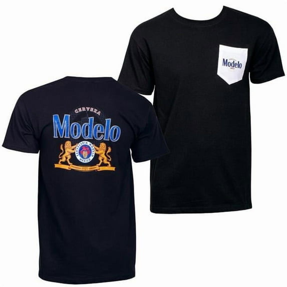 Officially licensed Modelo Cerveza Front and Back Print Pocket T-Shirt. Made from cotton, this black pocket t-shirt features a "Modelo Cerveza" label design on the back and logo on a white front pocket.