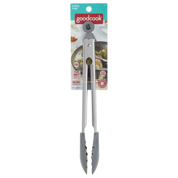 Our GoodCook Pro 11-inch Nylon Locking Tongs grab, toss and lift a variety of foods when cooking, serving or transferring. The stainless steel construction is durable with nylon tips that are heat safe up to 400°F and safe to use with non-stick and ceramic cookware and bakeware. 11-inch length keeps hands away from heat without sacrificing control. Locks closed for convenient storage.