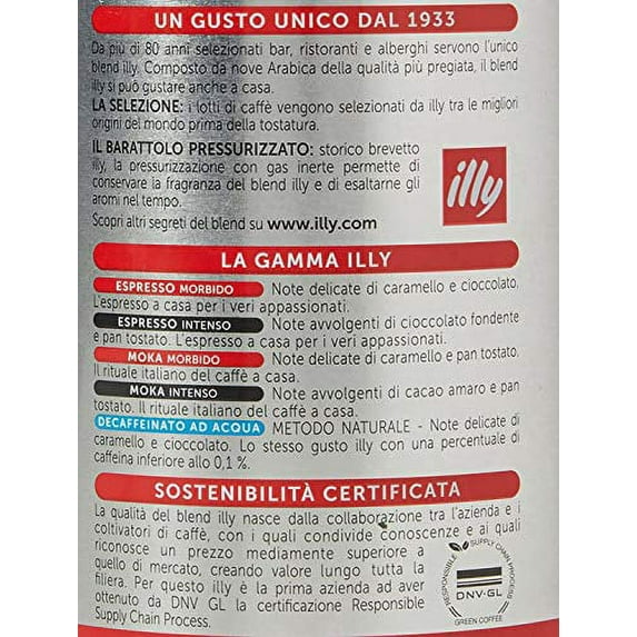 A cup of illy espresso is a brief but intense experience that caresses the senses, awakens the spirit and opens the mind. From the very first sip, illy's rich, fragrant aroma and distinctive, consistent taste provide an authentic Italian coffee experience to be savored over and over again. illy produces one single blend composed of nine types of 100% premium Arabica coffee--the very finest--and makes it available in different formats and roasts. This choice guarantees consistent quality and distinguishes the illy blend, ensuring it always has the same unique aroma and flavor. The green coffee beans are carefully selected at source from the plantations in Brazil, Central America, India and Africa and are then subjected to 114 quality control steps before being sold. The coffee is packaged in the signature illy can which provides a protective pressurized atmosphere to preserve its aroma for two years. illy ground espresso coffee is is finely ground to provide optimal extraction with espresso machines that accept ground, tamped coffee. Choose it if you enjoy personalizing the dosage of each espresso shot and the tactile pleasure of tamping the coffee. illy's dark roast features the full body and deep, rich flavor of a more intense espresso, where notes of cocoa intertwine with hints of caramel 8.8 ounce