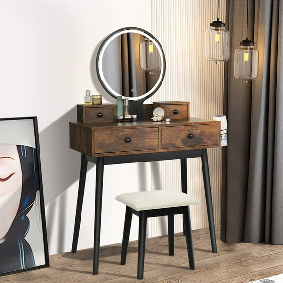 Kadyn Vanity Set with Touch Screen Lighted Mirror, Makeup Table with Cushioned Stool, 4 Drawers, Rustic Brown and Black