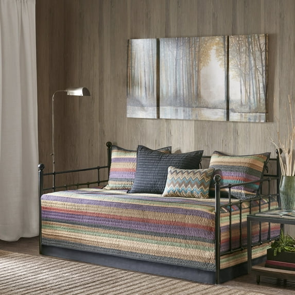 For an updated look, the Home Essence Rey 6 Piece Daybed Set can bring a brand new esthetic to your guest room. The quilted daybed cover features shades of purple, teal, and earth tones in thin striping to create a beautiful look. The three shams that come with this set have corresponding striping to match the daybed perfectly. A decorative pillow featuring the set's color scheme in zigzag embroidery and detail to give the entire look a pop of unique detail. The bedskirt gives this set its finishing touches. The set is machine washable for each care; the decorative pillow is spot clean only.