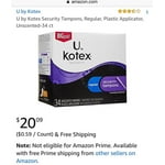 $1597current price $15.9788.7 ¢/eaU by Kotex Security Ultra Thin Pads with Wings, Regular, Unscented, 18 Count