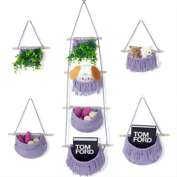 Hero image 0 of 4 Tier Hanging Fruit Basket, Purple Boho Handwoven Cotton Rope Macrame Fruit Storage for Kitchen Bathroom Bedroom, Detachable Wall Hanging Basket Over Door Organizer for Fruit Veggie Plant Decor, 0 of 9
