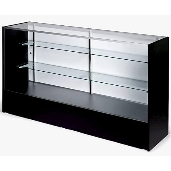 Our affordable 70" Full Vision display cases will provide your retail shop with an elegant way to showcase your merchandise for as long as you own it! The display case offers a number of features for your money that you will be happy that you took advantage of. With two rows of adjustable 1/4" split glass shelves, you can display your most precious merchandise, like jewelry or antiques. Our display cases also feature a low-pressure melamine laminate finish, steel interior standards, and shelf brackets. Our black and maple display cases are ready to assemble and available for immediate shipment. Dimensions: 38"H x 18"D x 70"L.