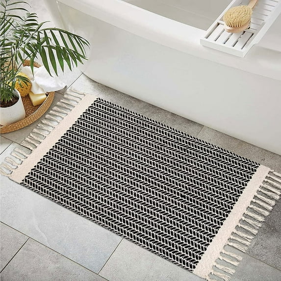 Moynesa 2'x3' Boho Bathroom Rugs Washable Rugs Small Front Door Mat Lightweight Kitchen Rug Woven Cotton Area Rug with Tassels Farmhouse Throw Rug Low Pile Carpet for Entry Laundry Room, Black $23.99