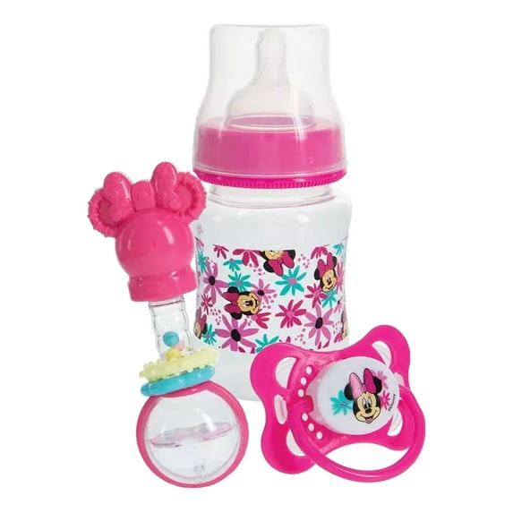 This 3-piece gift set by Disney Babyâ„¢ makes a great baby shower gift or new baby gift! Set includes a 5-ounce bottle, a pacifier, and a shake 'n rattle toy. Bottle, pacifier and toy feature colorful Minnie Mouseâ„¢ graphics. BPA-free. Set is packaged in a peggable blister card for easy retail displaying. Sold in increments of 6 setsEach set includes 1 bottle, 1 pacifier, and 1 shake 'n rattle toySet measures 10.75 inches by 3 inchesPeggable packagingBottle holds 5 ounces of milk, water or juicePacifier with handleBPA freeDesigns may varyLicensed Disneyâ„¢ product